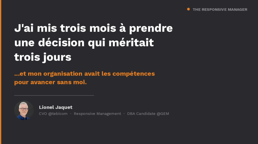 Trois options claires. Des managers capables de les évaluer. Des données disponibles. Et pourtant : trois mois de statu quo. Pas parce que l’analyse était complexe. Pas parce que les gens traînaient. Parce que la décision devait passer par moi, et que j’avais d’autres urgences.